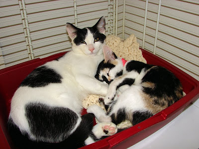 I lived at the SHELTER for SIX months. That is a LONG time. While you are there, it is GOOD to be NICE to all the other cats. I made MANY friends when I lived there. Do you RECOGNIZE me? I am the BIG cat on the LEFT. I liked to give HUGS to the other little cats. Most of my FRIENDS at the shelter left BEFORE me. I was a little SAD to say GOODBYE to them, but I was also GLAD they got good HOMES. Living in the SHELTER is not as much fun as living in a real HOME.